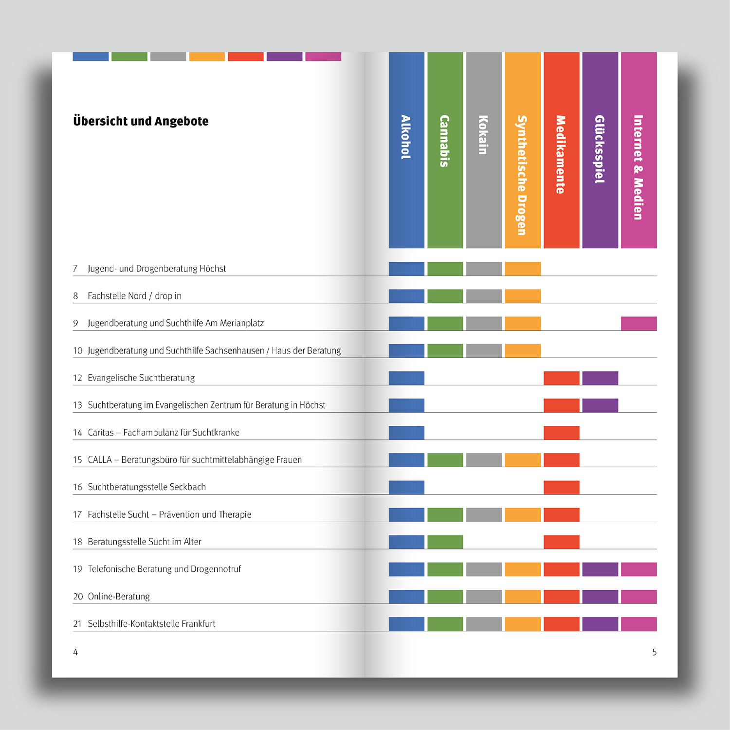 Die Broschüre bietet einen Überblick der Frankfurter Drogenberatungseinrichtungen, beschreibt deren Angebote kurz und ermöglicht eine Suche nach den eigenen Themen.