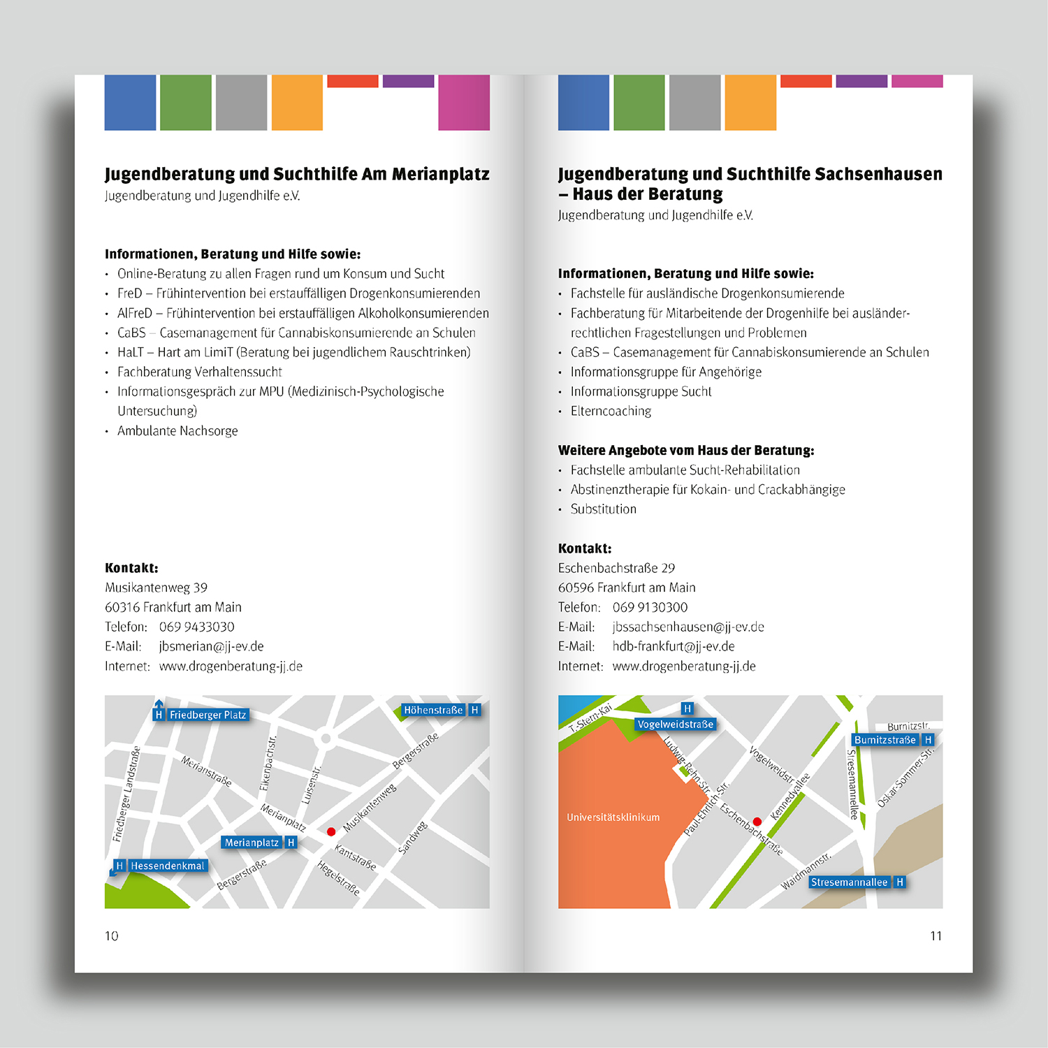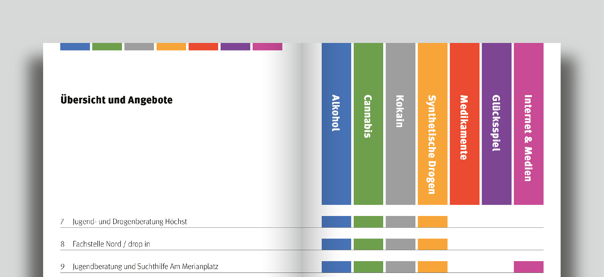 Die Broschüre bietet einen Überblick der Frankfurter Drogenberatungseinrichtungen, beschreibt deren Angebote kurz und ermöglicht eine Suche nach den eigenen Themen.
